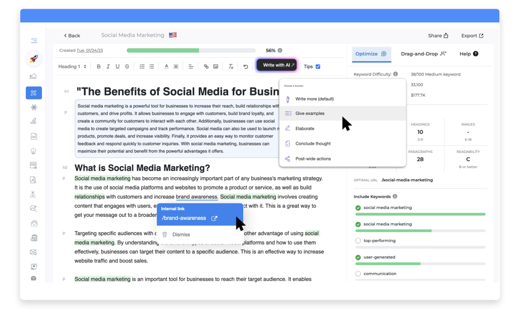 The Content Designer feature can generate full articles with one click. The built-in plagiarism checker saves you from having to use Copyscape. The tool also automatically suggests internal linking opportunities.